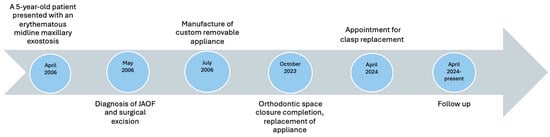 The importance of sufficient salivary flow was highlighted to the patient as it is necessary for the retention of the removable prosthesis in the oral cavity. She was informed that conditions or medications leading to hyposalivation should be closely monitored and appropriately managed. Although the patient had not undergone radiation therapy, they were educated about its potential impact on salivary gland function, should it become necessary in the future. This discussion aimed to reinforce the importance of salivary flow in retaining the removable prosthesis. A chronological overview of the diagnostic, surgical, orthodontic, and prosthetic milestones for this patient is provided in Figure 8.