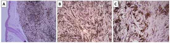 Histopathology of the lesion. (A) dermally based pigmented lesion, original magnification 40×; (B) spindle-cell and dendritic melanocytes with intense pigment deposition, original magnification 100×; (C) dendritic melanocytes are admixed with sclerotic stroma, original magnification 200×; staining (A–C) hematoxylin and eosin.