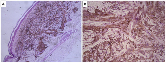 A previously healthy 55-year-old female presented to outpatient surgery consultation due to a pigmented lesion on the lateral side of the shoulder girdle on the right arm. The lesion measured 8 mm, was symmetrical with sharp outlines, and had a brownish-blue color. Despite the surgeon determining that no extensions were needed, the lesion was excised at the patient’s request for cosmetic reasons. The specimen sent for pathology was a leaf-like spin specimen, measuring 20 × 14 mm, with an acutely located, ovoid, sharply demarcated, and minimally elevated pigmented lesion, which was black–blue and measured 8 mm. Histology revealed a lesion located in the papillary dermis, comprising fusiform melanocytes with minimal intracellular pigment deposition. Melanocytes were arranged in nests surrounded by a rim of sclerotic stroma in which pigmented macrophages were also present (Figure 3). Due to the papillary dermal location of the lesion, artificial pseudopapilliform transformation and atrophy of the epidermis were noted.