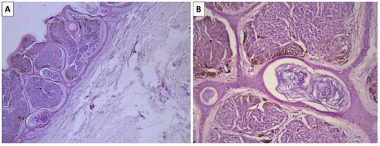 Histopathology of the lesion. (A) superficially located dermal melanocytic lesion, original magnification 40×; (B) spindle cells melanocytes arranged in nest surrounded by a thin rim of sclerotic stroma, original magnification 100×; staining (A,B) hematoxylin and eosin.