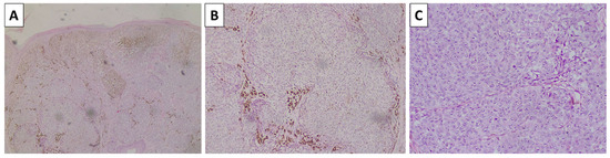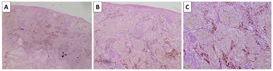Histopathology of the cheek lesion. (A) pigmented lesion in the superficial dermis, original magnification 40×; (B) higher magnification showing arrangement of the lesion in nests, original magnification 100×; (C) spindle cell melanocytes with subtle pigment deposition and a rim of sclerotic stroma surrounding the nests, original magnification 200×; staining (A–C) hematoxylin and eosin.