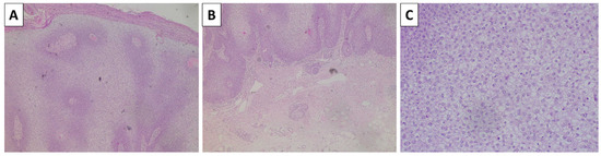 Histopathology of the auricular lesion. (A,B) acanthotic epidermis with superficial ulceration and no penetration of the basal lamina, original magnification 4×; (C) acanthotic proliferation by atypical keratinocyte with clear cell cytoplasmic change, original magnification 100×; staining (A–C) hematoxylin and eosin.