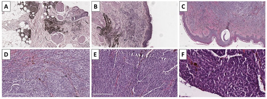 Histopathology of the lesion. (A) remnant dendritic blue nevus on the deep resection margin, original magnification 40×; (B) remnant dendritic blue nevus and adjacent melanoma nests underneath the epidermis, original magnification 40×; (C) subepidermal lesion with subtle pigmentation, original magnification 40×; (D,E) spindle cell melanocytes with subtle pigmentation and nesticles growth pattern, original magnification 100×; (F) increased mitotic activity amongst the nesticles, original magnification 200×; stains (A–F) hematoxylin and eosin.