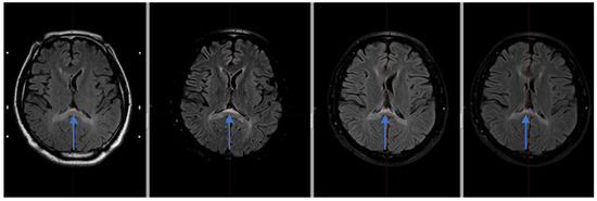 Hyperintense signal within the splenium of corpus callosum visible in the MRI FLAIR sequence in subsequent MR examinations—from the left: 12.2019, 06.2020, 12.2020, 01.2022 (blue arrows).