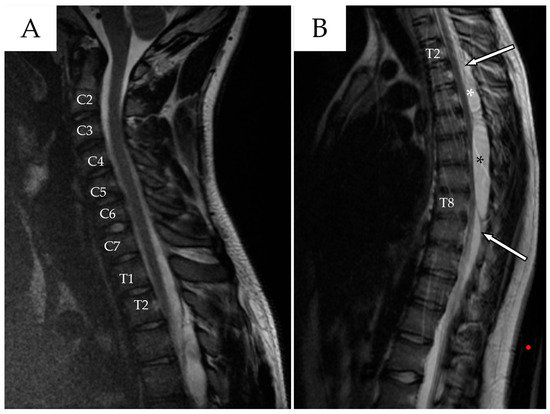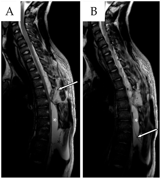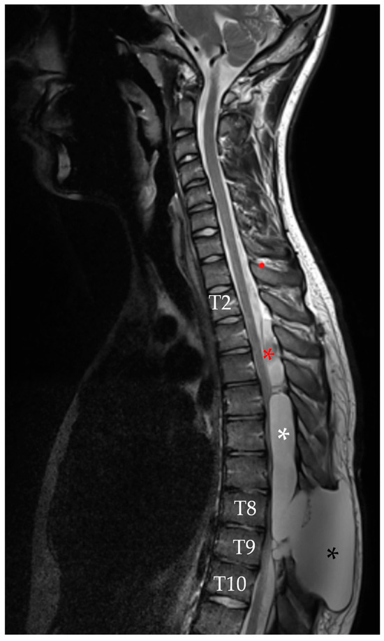 (A) Cervical spine ceMRI, sagittal section, TSE T2-WI. The cranial portion of the SAC is visible at the T2 level. To facilitate counting, the cervical vertebrae and the first two thoracic vertebrae are marked with their corresponding names. (B) Thoracic spine ceMRI, sagittal section, TSE T2-WI. The SAC is visible in its entirety, composed of a smaller cranial portion (T2–T4, white asterisk) and a larger caudal portion (T5–T8, black asterisk). The dural sac is easily identifiable (white arrows with black outlines), confirming the extradural location.