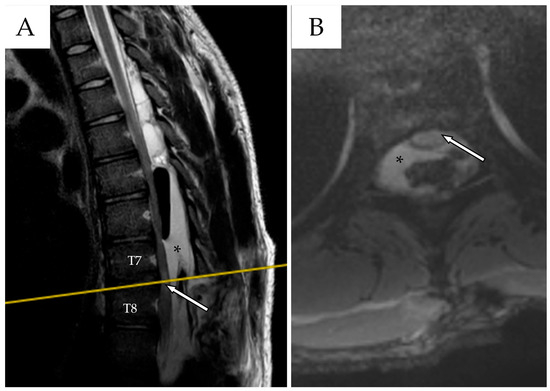 (A) Thoracic spine ceMRI, axial section, TSE T2-WI. The section is taken at the highest point of spinal cord compression (T7–T8), with early signs of radiological myelopathy (white arrow with black outlines). The spinal cord is dislocated anteriorly against the vertebral posterior wall. The SAC is marked with a black asterisk. (B) The yellow line indicates the level at which the axial section in (A) was obtained.