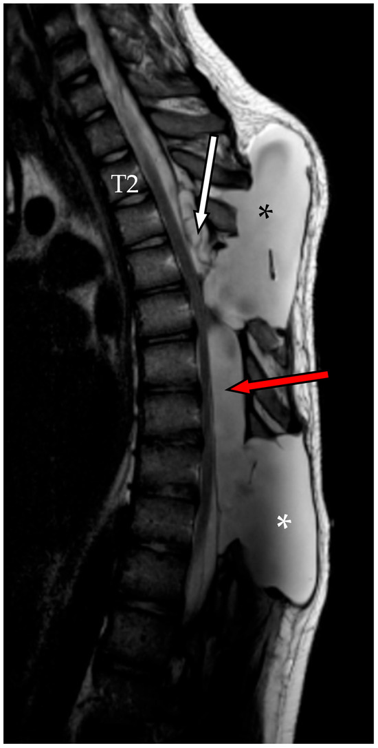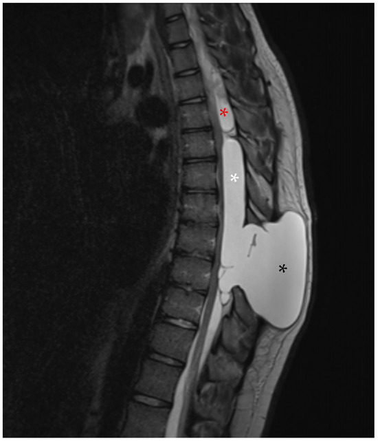 Emergent MRI, sagittal section, TSE T2-WI. Although the cranial component (red asterisk) remained stable, the caudal component (white asterisk), along with the pseudomeningocele (black asterisk), had enlarged and appeared under tension, which could explain the onset of the patient’s symptoms.