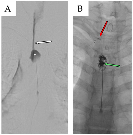 (A) Preoperative fluoroscopic myelography after contrast agent infusion shows the caudal portion of the cyst (white asterisk), along with the fistulous stream originating from the overlying fistulous tract (white arrow with black outline). (B) Postoperative fluoroscopic myelography confirms closure of the fistula at the T3–T4 level using metal clips (red arrow with black outline), while the remaining subarachnoid cavity (SAC) is filled with metallic coils and blood (green arrow with black outline).