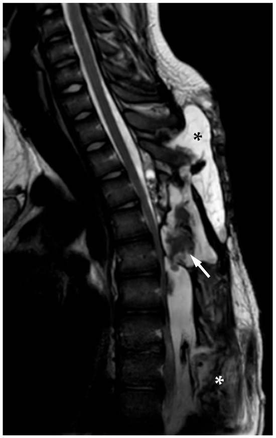 Sagittal T2-weighted MRI performed 7 days after the last surgery, which included percutaneous repair of the dural leak. The result of the blood patch is visible in the upper portion of the spinal arachnoid cavity (white arrow). A marked reduction in the cranial pseudomeningocele (black asterisk) is noted, along with near-complete resolution of the inferior pseudomeningocele (white asterisk).