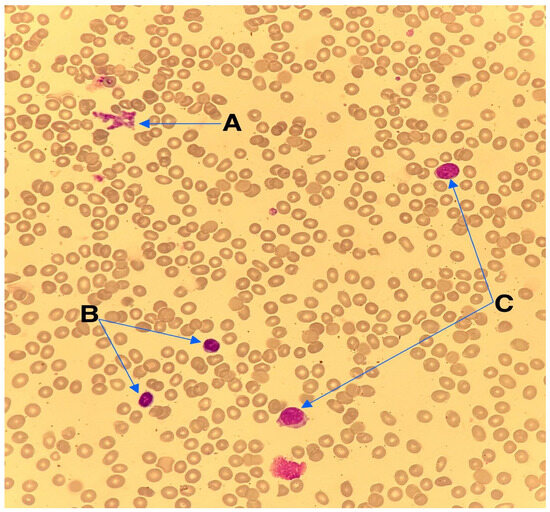 Wright–Giemsa staining of the bone marrow aspirate at a 40× magnification. (A) Platelet aggregation. (B) Lymphocytes. (C) Blast cells with a high nuclear-to-cytoplasmic ratio and cytoplasmic protrusions or “blobs” which resemble platelet budding, which suggests megakaryoblastic differentiation, a characteristic feature of AMKL.