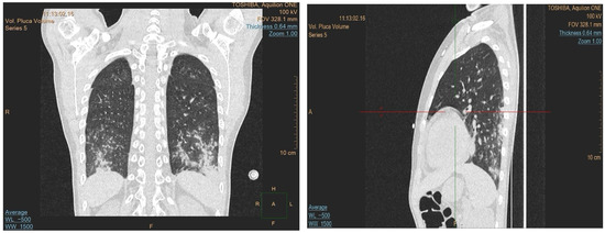 Chest CT scans with coronal and sagittal views confirming the presence of bilateral, diffuse ground-glass opacities mainly in the lower lobes, with reticular interstitial thickening.