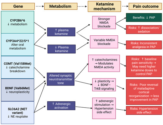 | BDNF (Val66Met) | Val66Met polymorphism → ↓ activity-dependent BDNF secretion → impaired neuroplasticity. No direct effect on ketamine metabolism, but may modulate response via synaptic plasticity. | May reduce response to ketamine in CNS conditions (e.g., depression, potentially chronic pain). In pain, impaired neuroplasticity may contribute to persistent central sensitization and reduced ketamine efficacy, especially in PLP. Interaction with CYP2B6 and COMT variants may affect tolerability and dosing. | [25,29,30,31] |