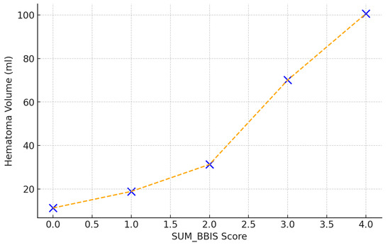 A strong correlation was observed between the composite SUM_BBIS score and baseline hematoma volume (Spearman r = 0.78, p < 0.001). Specifically, hematoma volumes increased markedly with each incremental increase in SUM_BBIS, from 11.3 mL at score 0 to 18.9 mL (score 1), 31.3 mL (score 2), 70.1 mL (score 3), and 100.6 mL at the maximum score of 4. This underscores the predictive power of the radiological complexity score regarding hematoma size (Figure 5).