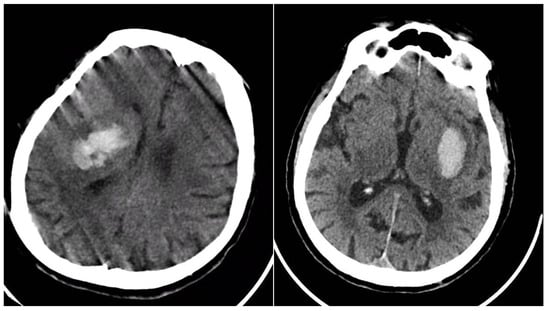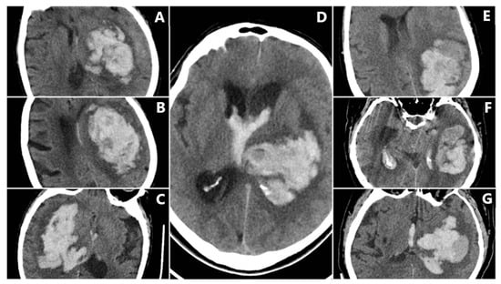 19. Boulouis, G.; Morotti, A.; Brouwers, H.B.; Charidimou, A.; Jessel, M.J.; Auriel, E.; Pontes-Neto, O.; Ayres, A.; Vashkevich, A.; Schwab, K.M.; et al. Association Between Hypodensities Detected by Computed Tomography and Hematoma Expansion in Patients With Intracerebral Hemorrhage. JAMA Neurol. 2016, 73, 961–968. [Google Scholar] [CrossRef]