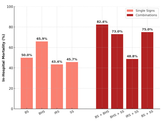 Figure 8 and Table 5 illustrates the marked increase in in-hospital mortality when multiple NCCT signs coexist. Mortality notably peaks for combined signs, such as the Blend and Black Hole Sign (82.4%), highlighting their strong cumulative prognostic significance.