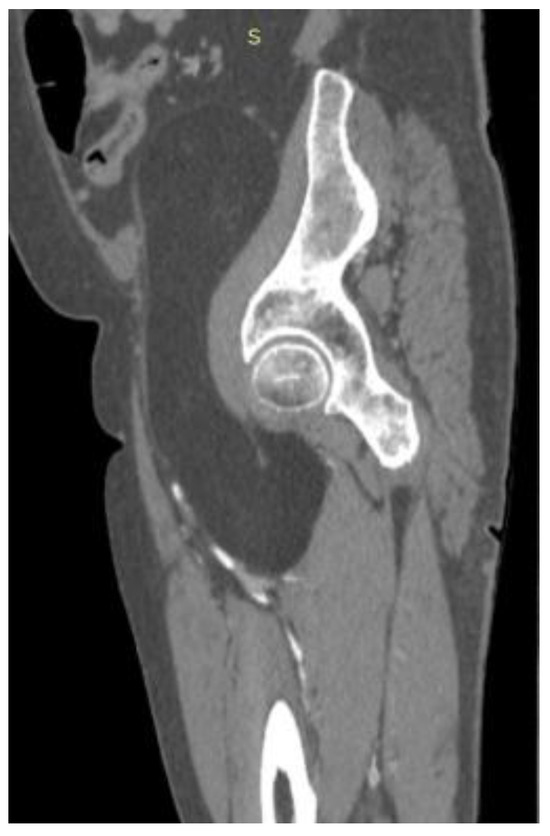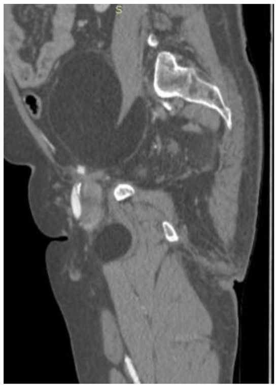 Sagittal CT reconstruction demonstrating a well-defined retroperitoneal fatty mass extending through the pelvic outlet into the proximal thigh, displacing adjacent soft tissues without evidence of osseous destruction or vascular invasion.