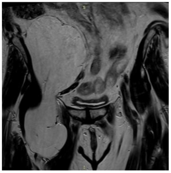 Coronal MRI (T1-weighted sequence) revealing a well-encapsulated lesion of high signal intensity, isointense with subcutaneous fat, confirming the lipomatous nature of the mass.