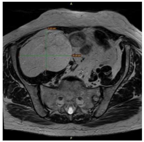 Axial MRI (T1-weighted sequence) showing the retroperitoneal mass 7.2 × 9.19 cm with clear margins and no infiltration of surrounding muscles or viscera.