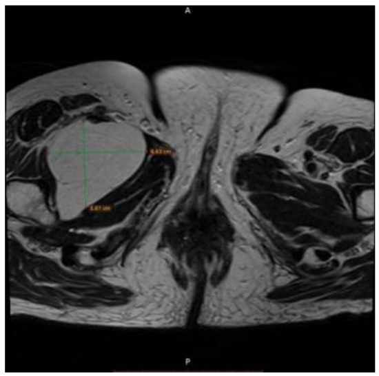 Axial T1-weighted MRI showing a well-circumscribed, homogeneous, hyperintense lipomatous mass in the left pelvic region, measuring approximately 6.6 × 5.9 cm, consistent with adipose tissue signal intensity and without evidence of infiltration into adjacent musculature or viscera.