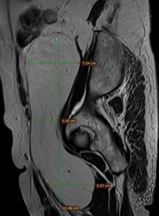 Sagittal T1-weighted MRI showing hyperintense lipomatous mass in the retroperitoneal fat extended throughout the pelvic outlet in the proximal thigh measuring approximately 22.4 cm in length.