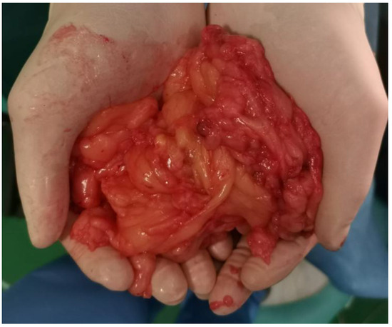 A midline laparotomy was performed. Upon inspection, a retroperitoneal mass of approximately 30 × 30 cm was identified in the right iliac fossa, exerting a mass effect and displacing the right colon and intestines medially. A peritoneal incision was made lateral to the right colon in the avascular Bogros’ space on the posterior leaf, and the tumor was dissected circumferentially (located posterior to the pain triangle) without injuring nerves, vessels, or the right ureter. The tumor extended toward the anterior thigh through the muscular lacuna, necessitating a second incision on the anteromedial aspect of the right thigh in the most prominent area. The anatomical layers were dissected while preserving the right femoral nerve, which was under extrinsic compression. The extensive anatomical distribution of the lesion precluded en bloc resection, thereby necessitating a dual surgical approach to achieve complete removal. Hemostasis was ensured, and the peritoneum was closed with a continuous suture. A contact drain was placed in the right thigh. The anatomical layers were closed, followed by skin closure and sterile dressing. Monoplanar laparoraphy was performed, followed by cutaneous suture and sterile dressing. The surgical specimen (Figure 9) was sent for definitive histopathological examination. The patient’s postoperative course was favorable: intestinal transit resumed on postoperative day 2. Symptomatic treatment was administered during hospitalization. The drain was removed, and the patient was discharged 5 days after surgery.