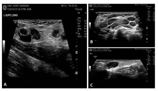 Ultrasound findings: (A) In the supraclavicular regions, multiple enlarged lymph nodes are also revealed that locally converge. Some of them appear hypoechoic and rounded; the largest is on the left with a maximum diameter of ~1.3 cm. (B,C) In the cervical regions and within the parotid glands, more commonly on the left, multiple enlarged lymph nodes of maximum diameter up to 2 cm are observed, which in some areas converge with an oval morphology and normal architecture.