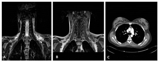 Radiological findings: (A,B) MRI in the cervical and supraclavicular areas, mainly on the left; multiple lymph nodes are observed that converge in some areas. Some of them, being rounded off, show an intermediate signal on the T1 sequence and a low signal on the STIR, while on the diffusion sequences, they show a restriction. The perilymph node tissue shows an intense high signal on fat suppression sequences to the left, while on T1 sequences, it shows inhomogeneous high signal and increased diffusion. (C) CT scan of the thorax and abdomen: no obvious pathological findings; a number of lymph nodes up to 7 mm in diameter are observed paraaortically and in the mesentery. Central tracheobronchial tree free, no pathologically sized lymph nodes in the hilar and mediastinum.