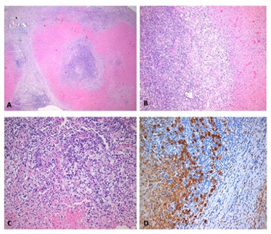 KFD can mimic more serious conditions such as tuberculosis or lymphoma, making early and accurate diagnosis essential. Although its etiology remains unclear, both infectious and autoimmune mechanisms have been proposed []. Diagnosis is confirmed histologically, with characteristic features including paracortical areas of apoptotic necrosis, karyorrhectic debris, and a proliferation of histiocytes, plasmacytoid dendritic cells, and CD8+ T lymphocytes []. Histopathologic differentiation from systemic lupus erythematosus (SLE) and non-Hodgkin lymphoma is critical [].