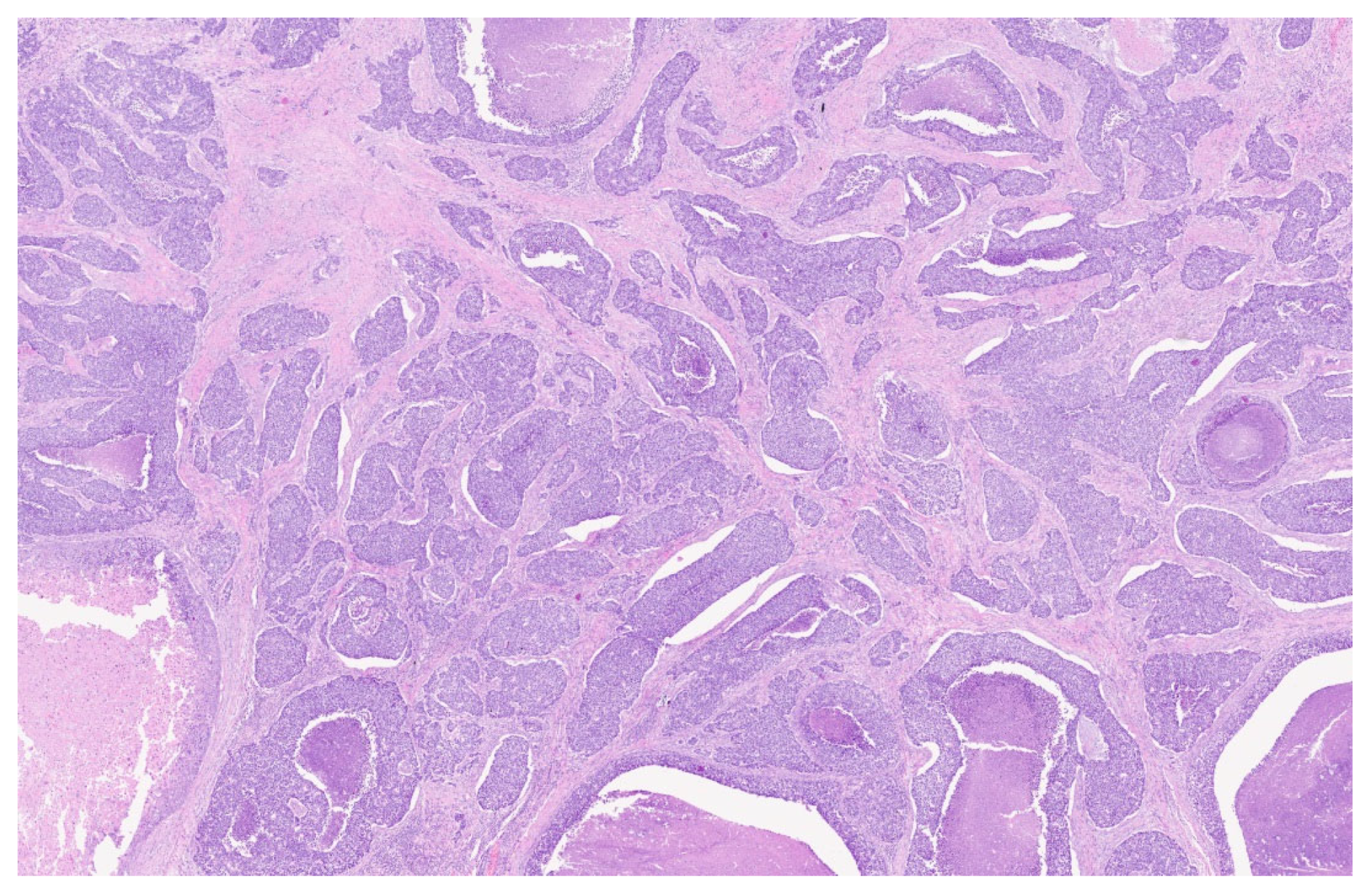 - Karasmanis, I.; Goudakos, J.K.; Vital, I.; Zarampoukas, T.; Vital, V.; Markou, K. Hybrid carcinoma of the larynx: A case report (adenoid cystic and adenocarcinoma) and review of the literature. Case Rep. Otolaryngol. 2013, 2013, 385405. [Google Scholar] [CrossRef]