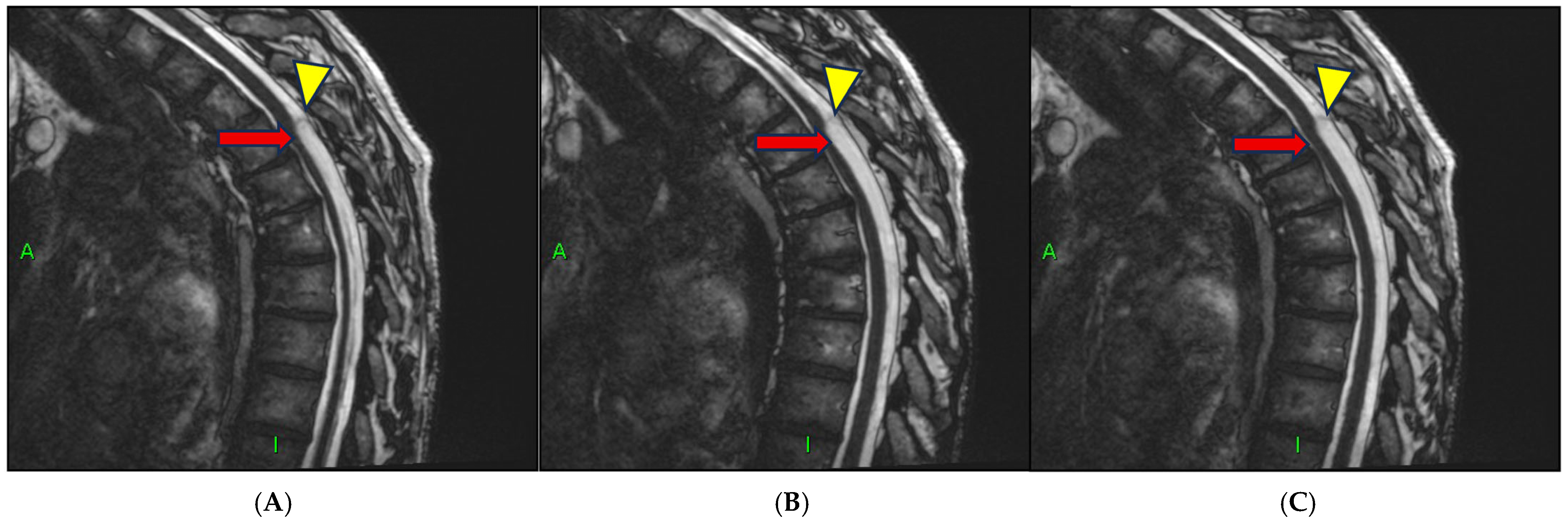 - Chang, H.S.; Nagai, A.; Oya, S.; Matsui, T. Dorsal spinal arachnoid web diagnosed with the quantitative measurement of cerebrospinal fluid flow on magnetic resonance imaging. J. Neurosurg. Spine 2014, 20, 227–233. [Google Scholar] [PubMed]