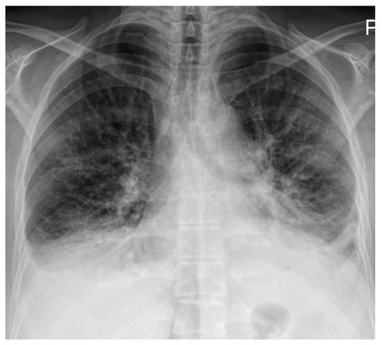 Chest radiography on admission demonstrating cardiomegaly with dilation of the central pulmonary arteries, increased interstitial markings with a perihilar “bat-wing” pattern, and bilateral pleural effusions, all indicative of pulmonary congestion. Bilateral elevation of the hemidiaphragms is also noted, possibly related to underlying myopathy.