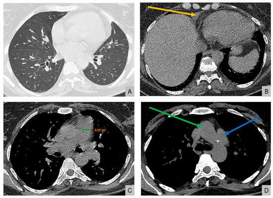 High-resolution computed tomography. (A) Normal lung parenchyma. (B) Small pericardial effusion (orange arrow). (C) Dilated main pulmonary artery measuring 30.7 mm (normal <27 mm in females). (D) The “egg-and-banana sign” in pulmonary hypertension: the dilated pulmonary artery (blue arrow, ‘egg’) seen above the lower margin of the aortic arch (green arrow, ‘banana’).