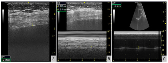 Respiratory evaluation also identified significant respiratory muscle weakness. Maximal inspiratory pressure (MIP) was −38 cmH2O (normal <−80 cmH2O in women), maximal expiratory pressure (MEP) +55 cmH2O (normal >100 cmH2O), and sniff nasal inspiratory pressure (SNIP) 34 cmH2O (normal >70 cmH2O), all below the lower limits of normal. Diaphragm ultrasound (Figure 3) revealed end-expiratory thickness 0.9 mm (right) and 1.3 mm (left) (normal for women >1.7–2.0 mm) (Figure 3A), thickening fraction 11% (right) (Figure 3B) and 16% (left) (normal >20%), and inspiratory excursion < 1.0 cm (Figure 3C) bilaterally (normal for women >1.5 cm during quiet breathing), consistent with diaphragmatic weakness. Polysomnography showed an apnea–hypopnea index of 13 events/hour, predominantly central hypopneas (n = 12), with a nadir oxygen saturation of 86% and no obstructive events. The patient’s body mass index was 23 kg/m2.