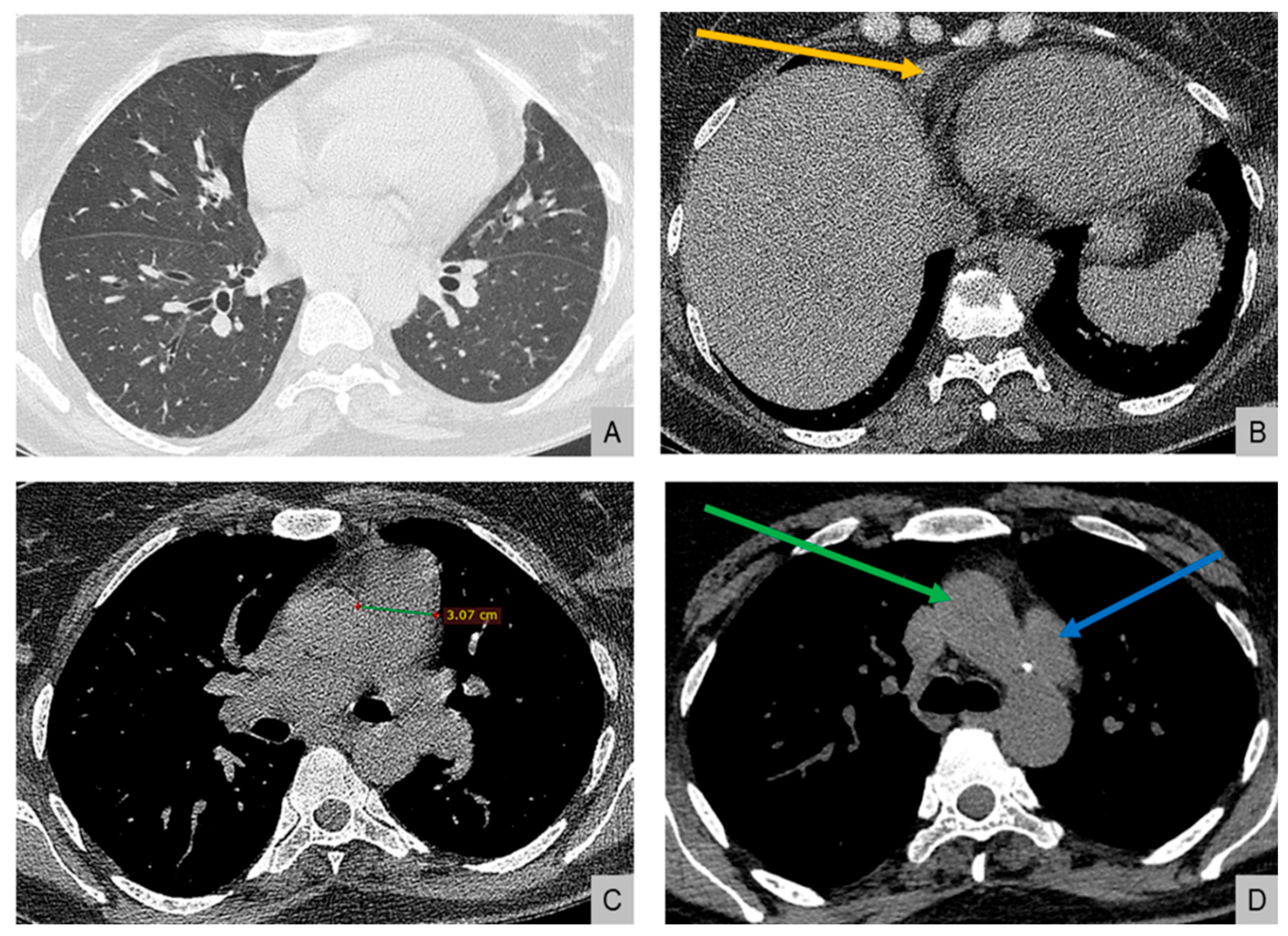 Figure 2. High-resolution computed tomography. (A) Normal lung parenchyma. (B) Small pericardial effusion (orange arrow). (C) Dilated main pulmonary artery measuring 30.7 mm (normal <27 mm in females). (D) The “egg-and-banana sign” in pulmonary hypertension: the dilated pulmonary artery (blue arrow, ‘egg’) seen above the lower margin of the aortic arch (green arrow, ‘banana’).