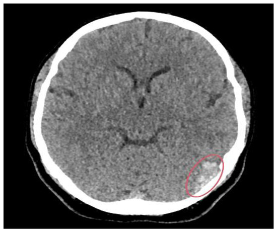 CT brain scan showing hyperdensities in the left temporal lobe (red circle), indicating acute haemorrhagic foci.