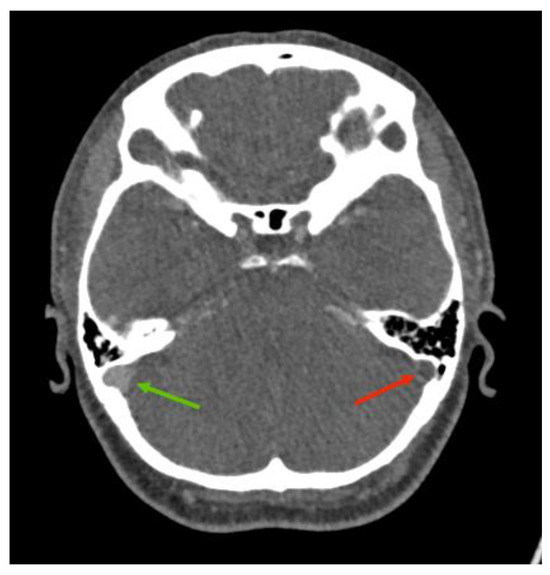 CT venogram intracranial showing a filling defect in the left sigmoid sinus (red arrow) in comparison to the normal right sigmoid sinus filled with contrast media (green arrow).