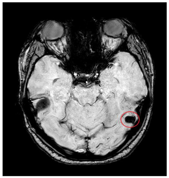MRI head scan showing a so-called blooming artefact (red circle), indicating thrombosis of the lateral tentorial sinus on the left side with thrombosis extending into the vein of Labbe, resulting from the previously described thrombosis of the left.