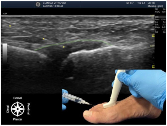 Alternatively, we propose an opposing technique, based on ultrasound-guided diagnostic intra-articular infiltration of the metatarsophalangeal joint, a sealed cavity consistent with its capsular anatomy, that would allow the anesthetic effect to remain confined to the articular compartment. The clinical rationale for this approach relies on the proximal origin of the MTP articular branches, as described in classical anatomical studies [13]. If the patient does not experience improvement after this infiltration, it may suggest that the pain does not originate from the joint and that the most likely cause is neuropathic. This sequential strategy—first infiltrating the joint and, only in the absence of response, performing the nerve suppression test—could improve diagnostic specificity and reduce the risk of misinterpretation. In addition, the use of ultrasound ensures anatomical precision and technical safety [3].