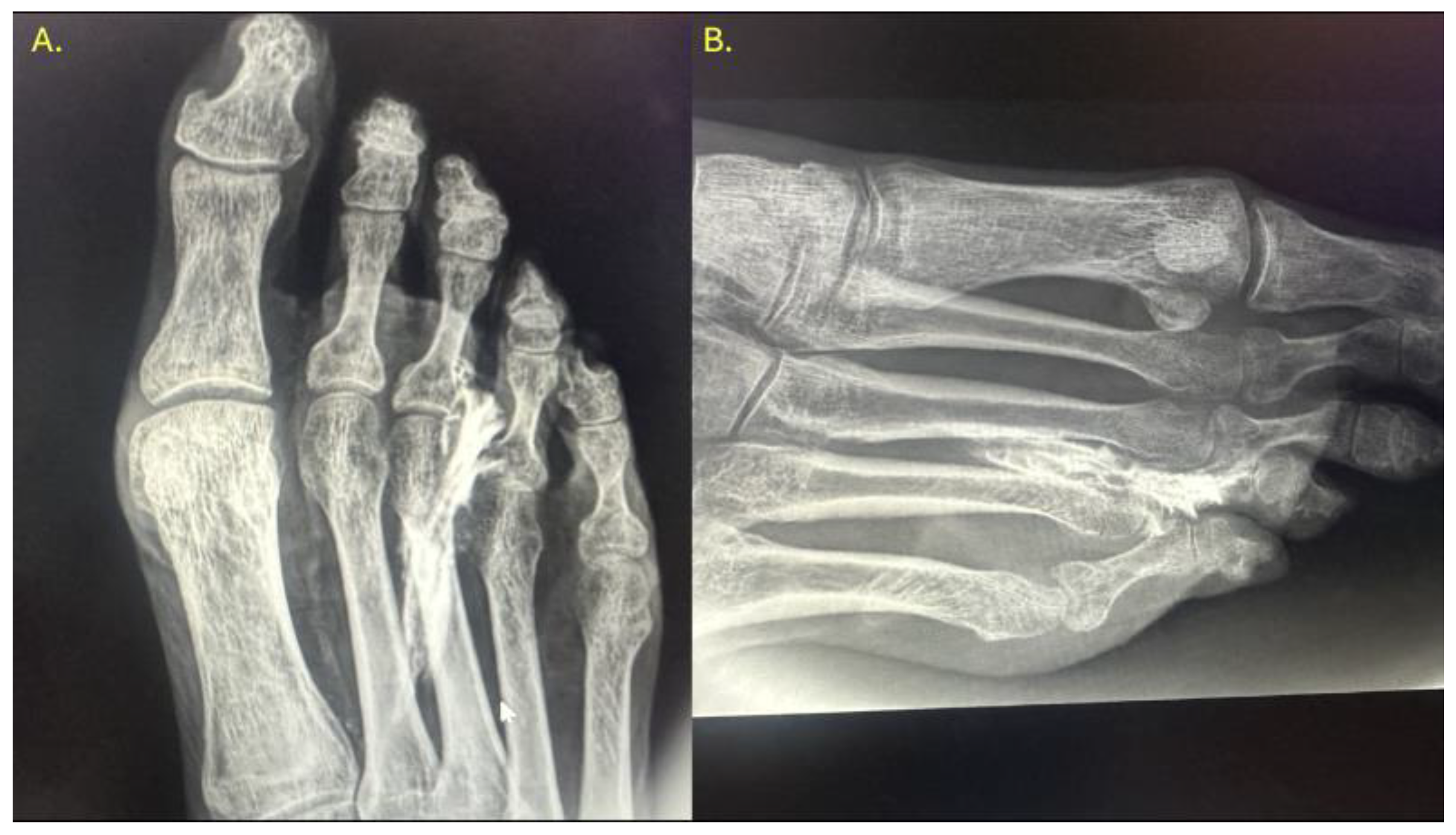 A 25G, 40 mm needle was used. A volume of 1 cc of iodinated contrast medium (iopamidol 300 mg/mL) was injected at each site. For the MTP joints, a dorsal longitudinal approach was employed, with the needle oriented parallel to the metatarsal shaft and advanced to the base of the proximal phalanx, avoiding the dorsal capsule and extensor tendons. For the IM space, a transverse dorsoplantar approach was used. The needle was positioned in the deep plane of the intermetatarsal space, just beneath the deep transverse intermetatarsal ligament and above the course of the common plantar digital nerve.