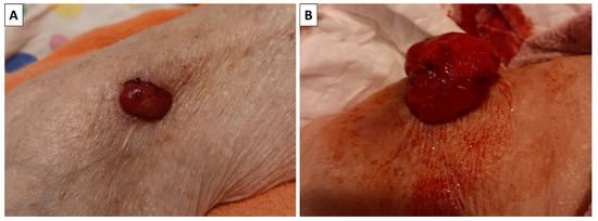 Tumors with trichoblastic differentiation, on the other hand, lack the clefting and have a specialized secondary component comprising a cellular stroma wrapping the cellular nest, recreating the physiological structure of the hair shaft [4]. This stroma often intersects the basaloid nest and produces mesenchymal papillary bodies [2]. However, while basal cell carcinoma is indeed an exceedingly common malignant tumor, despite the distinct features described, trichoblastic tumors remain underrecognized and underreported [1,4]. Chief among these is their rarity, and secondly, in some cases, features may overlap. Due to fixation artifacts, there may be some clefting present in trichoblastomas; however, this is always associated with a lack of mucin production [2]. Secondly, reactive dermal changes in basal cell carcinoma may produce a hypercellular dermis that mimics the specialized stroma of trichoblastomas [2]. Lastly, even though basal cell carcinoma, as a malignant tumor, presents with at least minimal cell and nuclear atypia and increased mitotic activity, in cases of long-lasting trichoblastomas, a degenerative atypia may mimic that seen in basal cell carcinoma, and in larger and rapidly growing lesions, mitotic activity may be prevalent [2,4]. From a clinical standpoint, the diagnosis of trichoblastomas is rarely suspected, and a basal cell carcinoma diagnosis is not often questioned, as both tumors develop predominantly in the elderly and have a high affinity for the sun-exposed skin of the head and neck [2]. While in their biological nature, trichoblastomas and basal cell carcinoma differ significantly, with one being benign and the other, while having negligible metastatic potential, is still a locally aggressive malignant tumor, the definitive treatment for both is surgical excision.