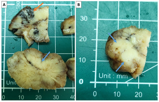Sectioning of the specimen. (A) Areas of intense pigmentation (orange arrow) and more firm grayish zones (blue arrows); (B) solid, nested zones appearing on the section (blue arrows).
