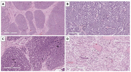 Histopathology of tumor components. (A) Nests with peripheral palisading, H&E stain, original magnification 100×; (B) retiform areas, H&E stain, original magnification 100×; (C) stroma with focal intersection of the nest and formation of papillary mesenchymal-like bodies, H&E stain, original magnification 100×; (D) bizarre stromal component, H&E stain, original magnification 100×.