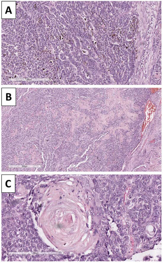 Histopathology of the tumor. (A) Pronounced mitotic activity, H&E stain, original magnification 200×; (B) areas of comedo-like necrosis centrally within the nests, H&E stain, original magnification 100×; (C) bizarre stroma with tumor-cell emboli in the blood vessels, H&E stain, original magnification 100×.