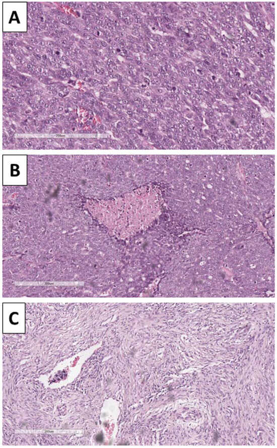 Despite fewer than a dozen cases of trichoblastic carcinosarcoma being reported, they have a strictly defined nomenclature with both the epithelial and stromal components undergoing malignant transformation, and based on the degree of atypia and especially the presence of comedo-type necrosis and the degree of stromal anaplasia, they are separated into high- and low-grade [15,16,21,22,23,24]. By definition, in trichoblastic carcinosarcomas, both the epithelial and mesenchymal (stromal) components undergo malignant transformation. As such, they represent a rare group of true carcinosarcomas, with separate epithelial and mesenchymal malignant components and are not tumors wherein the epithelial component undergoes epithelial–mesenchymal transition [22]. Differential diagnosis is again broad and once again includes basal cell carcinoma in its sarcomatoid type; however, in trichoblastic carcinosarcoma, as already mentioned, the epithelial and mesenchymal components are sharply demarcated and do not mix, while sarcomatoid basal cell carcinoma shows evident epithelial–mesenchymal transition [22].