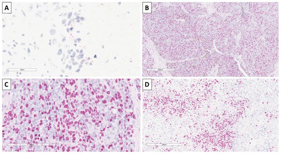 Immunohistochemistry of the tumor. (A) Focal CK20 dot-like reaction, original magnification 400×; (B) high Ki-67 proliferative index in epithelial component, original magnification 40×; (C) high Ki-67 proliferative index in epithelial component, original magnification 200×; (D) high Ki-67 proliferative index in stromal component, original magnification 100×.