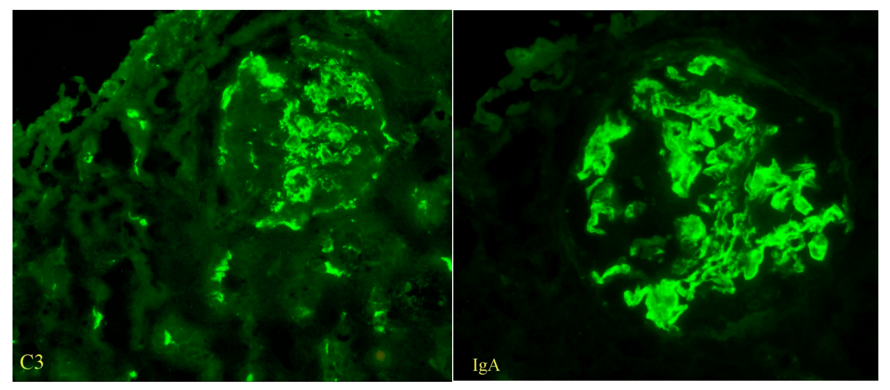 Immunofluorescence microscopy revealed dominant mesangial and subendothelial IgA and C3 deposits, with minimal staining for IgM, C1q, fibrinogen, and light chains consistent with IgA nephropathy [
