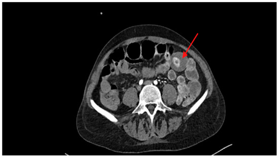CT scan identified an intensely hyperdense endoluminal spot in the small intestine (red arrow).