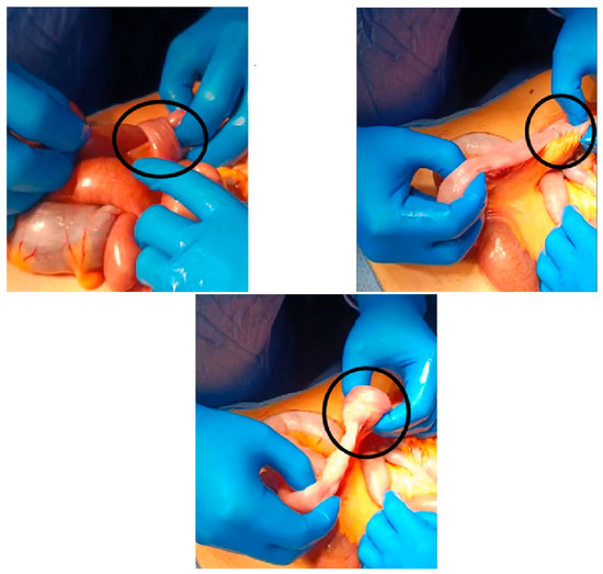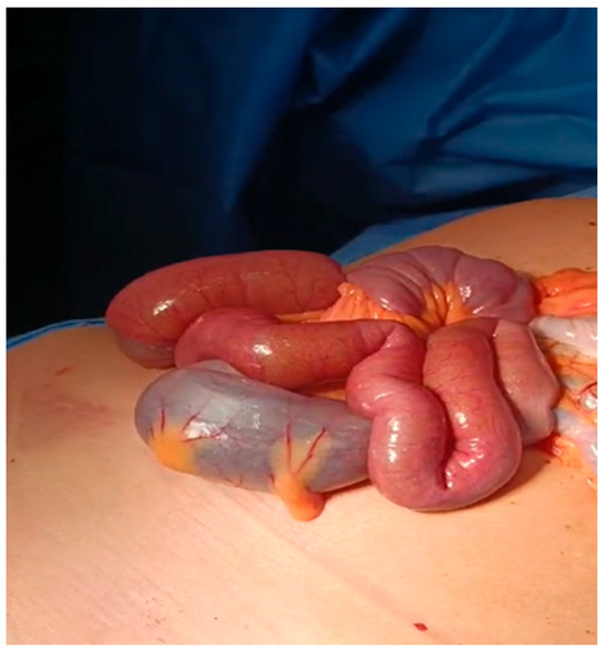 A median laparotomy was elected as the surgical approach, which revealed immediately the presence of intestinal dilation with the co-existence of an ischemic tract (Video S1) (Figure 3). The assessment of intestinal ischemia was performed intraoperatively by evaluating both the serosa color and superior mesenteric artery pulsation. Furthermore, it showed intussusception of the small intestine approximately 50 cm from the Ligament of Treitz (Figure 4).