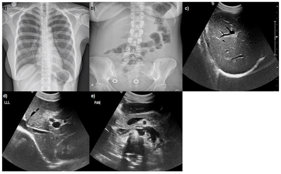 (a) Normal chest X-ray; (b) abdominal X-ray: mild air–fluid levels; (c–e) abdominal ultrasound: hepatomegaly, wall-thickening of gall bladder without stones, ‘starry sky’ appearance of parenchyma, and findings of hepatitis.