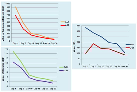Progression of liver function tests during hospitalization and at follow-up visits. Alanine aminotransferase (ALT, U/L), aspartate aminotransferase (AST, U/L), alkaline phosphatase (ALP, U/L), gamma-glutamyl transferase (γ-GT, U/L), total bilirubin (T-BIL, mg/dL), and direct bilirubin (D-BIL, mg/dL).